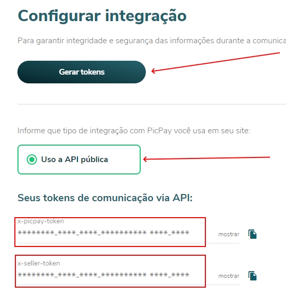 Na próxima tela você terá acesso aos Tokens do PicPay que são responsáveis pela comunicação e identificação da sua conta junto ao PicPay. Para gerar os token, primeiro clique no botão “Gerar Tokens“. Verifique se a opção que vai estar habilitada é a “Uso a API pública“. Feito isso, serão gerados dois token o picpay-token e o seller-token. Copie os dois para utilizar na sua loja.
